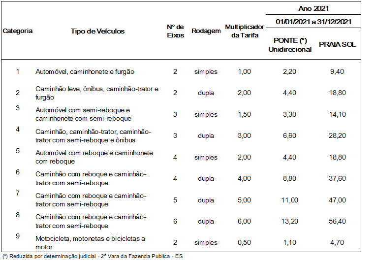 A Agência de Regulação de Serviços Públicos (ARSP) publicou, nesta quarta-feira (30), a Resolução nº 045, que estabelece os valores das tarifas a serem praticadas no Sistema Rodovia do Sol para o ano de 2021. O valor da tarifa para carros de passeio será de R$ 2,20 na Terceira Ponte e R$ 9,40 na Praça Praia Sol (Guarapari). Os novos valores passam a vigorar a partir das 0h do dia 01º de janeiro.